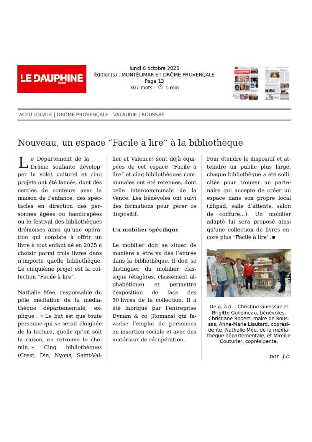 Article paru dans le Dauphiné Libéré le Lundi 6 octobre 2025